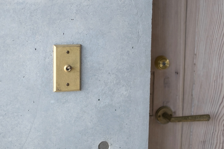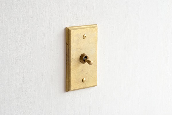真鍮鋳物のトグルスイッチを取り付けた、操作感の心地よいスイッチプレートです。こちらはスイッチごとに点灯箇所を示すネームを入れるセミオーダータイプです。複数スイッチの場合にも点灯箇所が分かりやすくなります。