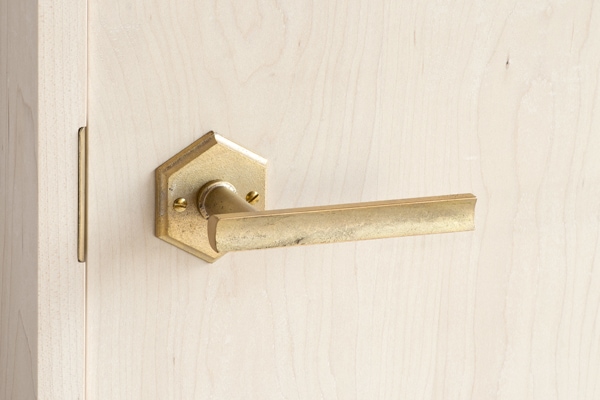 The handle will develop a sheen and darken in color the more it is touched, depending on the installation location and frequency of use. The plate will naturally gain a deeper character over time.