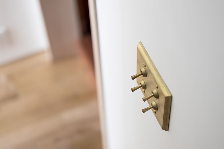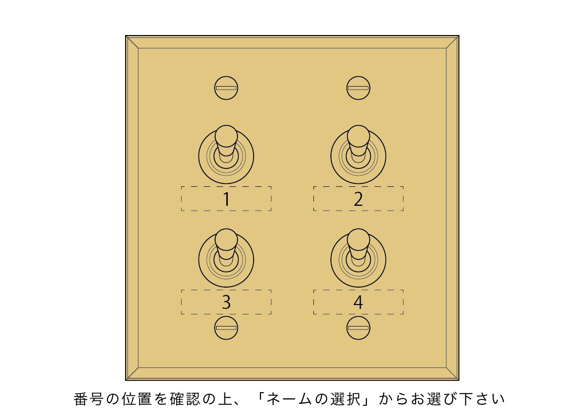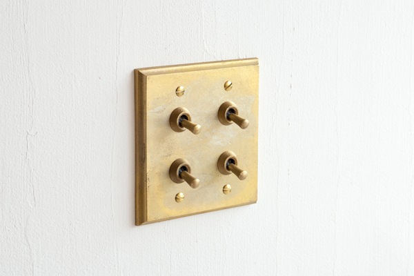 真鍮鋳物のトグルスイッチを取り付けた、操作感の心地よいスイッチプレートです。こちらはスイッチごとに点灯箇所を示すネームを入れるセミオーダータイプです。複数スイッチの場合にも点灯箇所が分かりやすくなります。