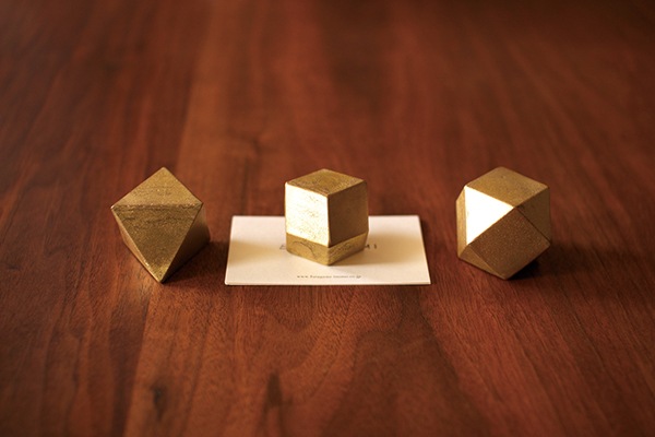 This is a brass-cast textured paperweight available in "Triangle," "Rhombus," and "Square" shapes. Each of the three shapes is about the size of a walnut, fitting comfortably in your hand. Despite being polyhedral, all the faces are parallel, making them easy to pick up.
