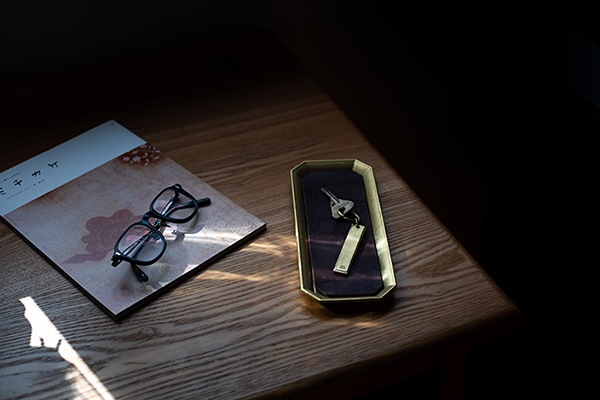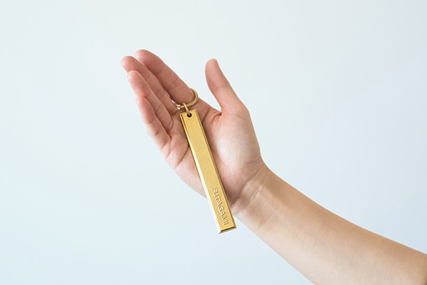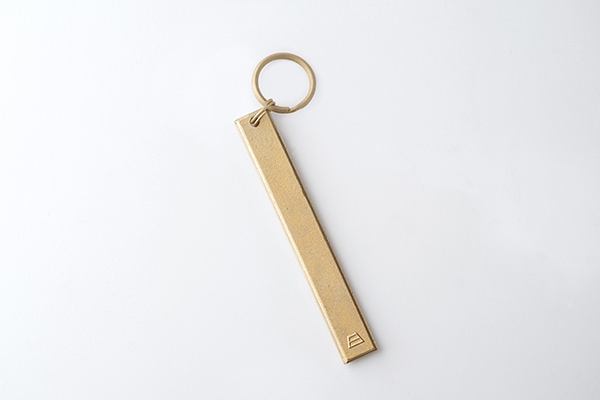 MATUREWAREのネームプレートと統一感のある形状をしたキーホルダー鋳肌プレート長です。プレートは2種類の長さがあり、「長」は、ホテルのルームキーのようなサイズ感となっていて、手にするとズッシリとした真鍮の存在感があります。「短」は車にキーを差し込んだ時に、足にぶつかりにくい長さになっているので、それぞれ取り付けるキーの種類や本数によって選ぶことができます。仕上げは、無地とFUTAGAMIのロゴマーク入りから選ぶことができます。