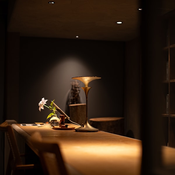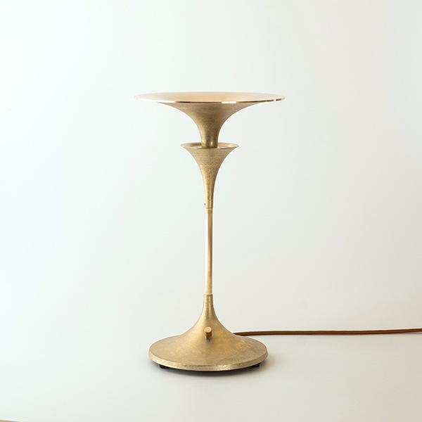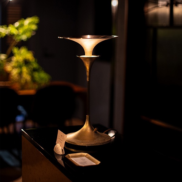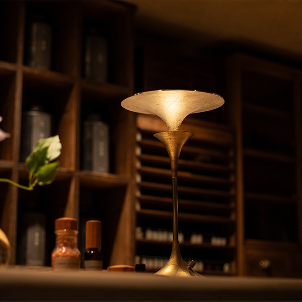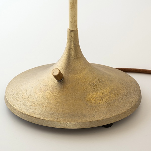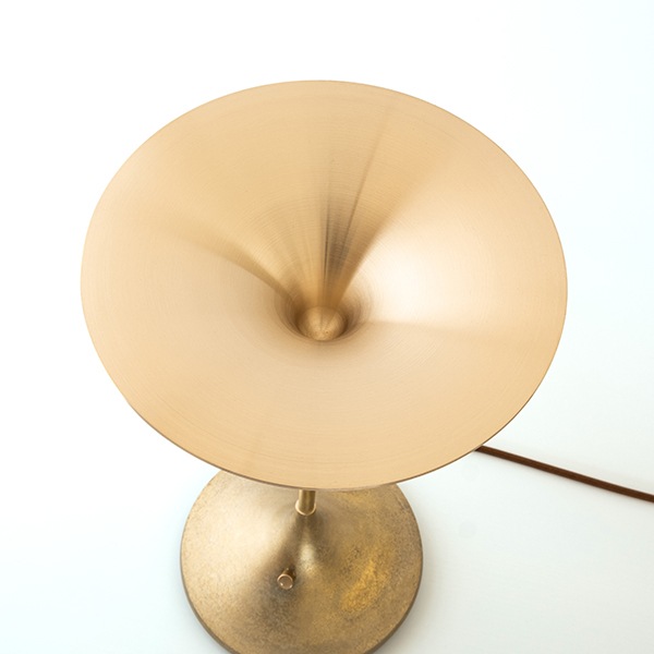 テーブルランプのベースのつまみが調光ダイヤルスイッチになっています。ファウンテンテーブルランプは、寝室のベッドサイドやリビングのコーナーテーブルなどのリラックスしたスペースや、バーカウンターやホテルのチェックインカウンターなどに設置することをイメージしてデザインしました。真鍮の優しい光をぜひ皆さんの空間で愛でていただければと思います。