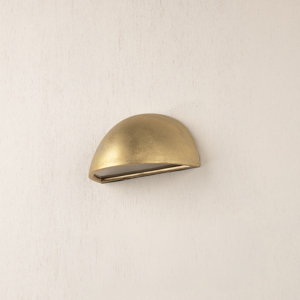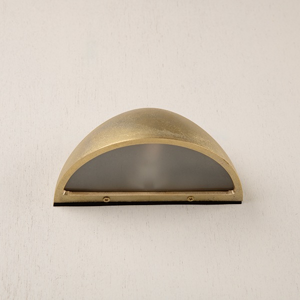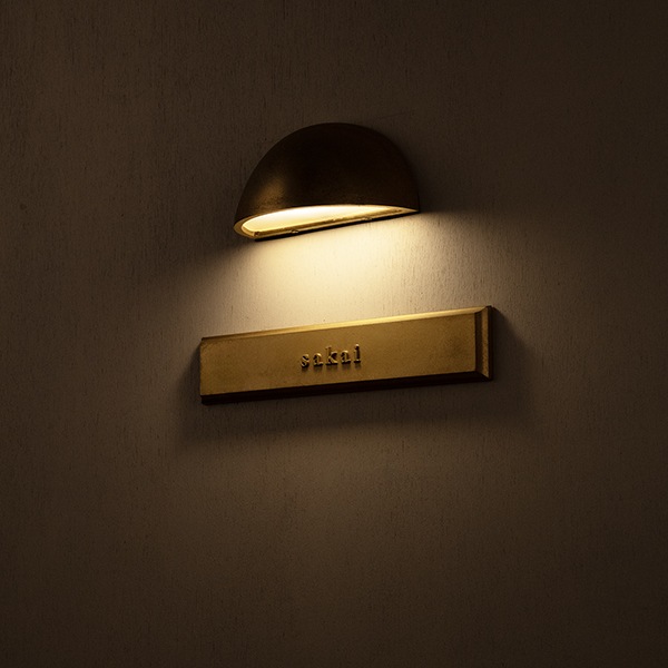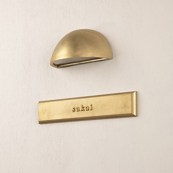 ネームプレート上部に取付けるために設計された真鍮鋳物製のミニマルなライトシリーズ。防滴仕様で雨や風にも耐え、エントランスや門柱など屋外で安心して使用できます。屋外に据えた真鍮は時間とともに酸化し、黄金色から深い琥珀色へとゆっくり熟成します。 この “経年変化の美しさ ”こそネームライトの醍醐味。日中は味わい深いマテリアルとして存在感を放ち、夜間は柔らかな光で表札を浮かび上がらせ、家の顔を静かに彩ります。取付け位置はネームプレート以外にも応用可能。 門扉まわりのエクステリア照明、アプローチの足元灯、さらには室内廊下や階段壁のアクセントライトとしても活躍します。3種類のフォルム(フード/ドーム/ベル)と2種の仕上げ(鋳肌/黒染め)を組み合わせれば、外観からインテリアまでトーンを揃えた美しい光のラインを構成できます。