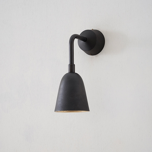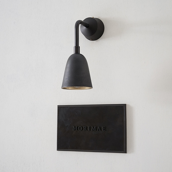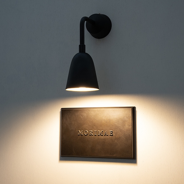 ネームプレート上部に取付けるために設計された真鍮鋳物製のミニマルなライトシリーズ。防滴仕様で雨や風にも耐え、エントランスや門柱など屋外で安心して使用できます。屋外に据えた真鍮は時間とともに酸化し、黄金色から深い琥珀色へとゆっくり熟成します。 この “経年変化の美しさ ”こそネームライトの醍醐味。日中は味わい深いマテリアルとして存在感を放ち、夜間は柔らかな光で表札を浮かび上がらせ、家の顔を静かに彩ります。取付け位置はネームプレート以外にも応用可能。 門扉まわりのエクステリア照明、アプローチの足元灯、さらには室内廊下や階段壁のアクセントライトとしても活躍します。3種類のフォルム(フード/ドーム/ベル)と2種の仕上げ(鋳肌/黒染め)を組み合わせれば、外観からインテリアまでトーンを揃えた美しい光のラインを構成できます。